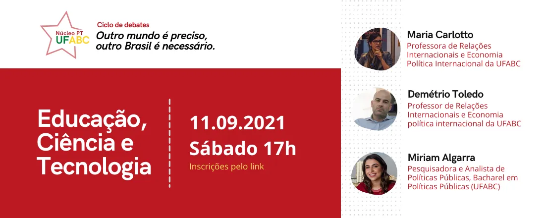 Considerando a excepcionalidade que vivemos em nosso país e a aproximação do período eleitoral de 2022, nós, estudantes, trabalhadores e trabalhadoras petistas da UFABC, realizaremos um Ciclo de Debates sobre o projeto de pais que queremos com o intuito de contribuir para o Programa de Governo do presidente Lula.